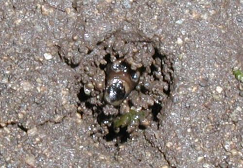 H苔を取り除くと、穴を閉じる幼虫の口元が見える。