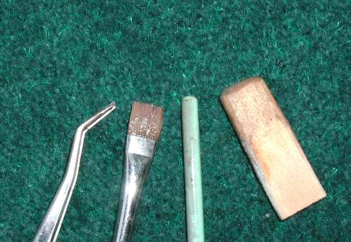 右から楕円形の木型、内部を整える木型の先が丸くしています。土面を整える筆、不要なものを挟むセット。