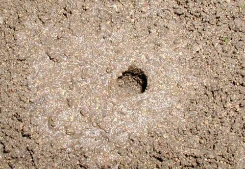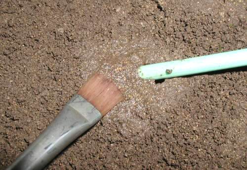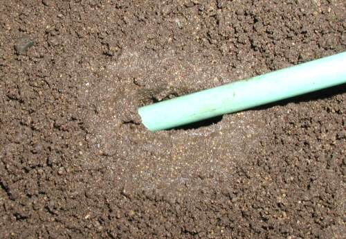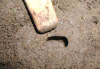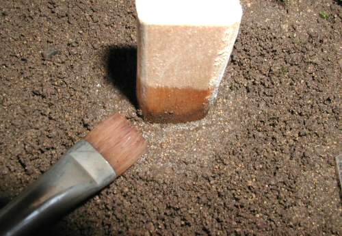 A穴をつくる木型を土面におおよそ2〜3p土面にさしこみ木型の周りを水を付けた筆で固める。