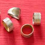 | @指貫(針うけ) | A右手に針を持ち、針の穴の方を指貫に当てます。 | B指貫で針を受けながら針を布に刺す。 | C指貫で針を受けながら針を押す。その時、左爪の上に針が出ています。(指に針が刺さらないように注意しましょう) | |||||
