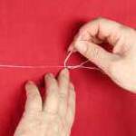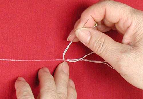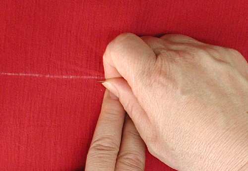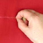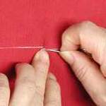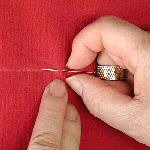 ●私も、針縫いの基本練習、作業台に布を置きチャコでラインを引き、その上をぴと針ずつ繰り返し練習してきました。 ● シツケ縫いには、作業台に布を置いて縫う方法と、手に布を持って縫う方法があります。 ・針にシツケ糸を通し(80〜100cm)コブをつくって置きましょう。 ■初めて挑戦される方へ ●A〜Gまでに挑戦される方は、時間を気にしないで確実に、できるようにくり返し練習をしましょう。 ●始めの内は指に針が刺さります練習あるのみです ●親指と人さし指で針を持って布に刺し、指貫で針を押し、針を押しきるまでに、出てきた針をつまみます。 (一連の動作です)針を抜く(コブまで抜き取る) ●4〜5針縫い、一気に糸を抜くやり方もあります。 ●糸を引くかげんで糸にツレやタルミが生じることがあります。糸を引き抜く時に右手に針を持ったまま、 右手小指に糸を引っ掛け糸かげんすることができます。 ○指貫(針うけ)の使い方になれることが大切です。 |