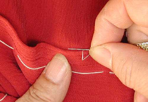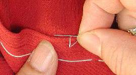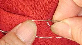 @一重の方は表に針目が出ないように布地を少しすくいます。