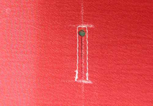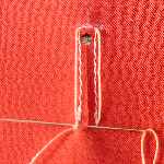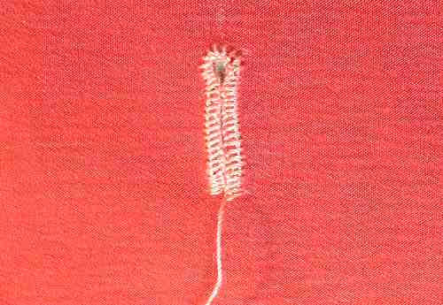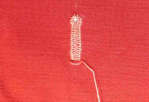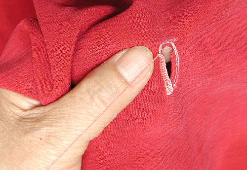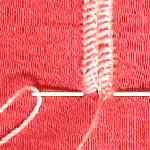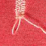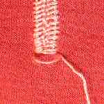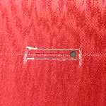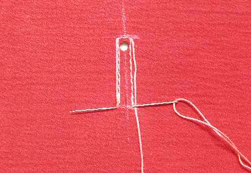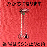 | Gハトメ穴を開けたところからは、ミシン縫い目巾をあてにしないで、2mm.巾で縫いましょう ※ハトメ穴のところからは、締めつける糸を真上に同じ角度で引き抜きます。 |