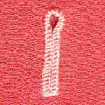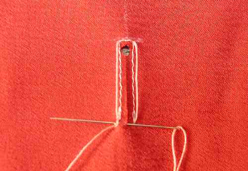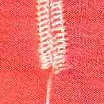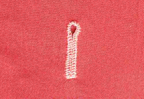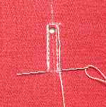 ■穴カガリ縫い(釦ホール) 本来は、手縫いの穴カガリをする時に、もちいられる縫い方です。穴カガリミシンが開発されてからは、はやくて美しくできるので、手間のかかる手縫いの穴カガリはなくなり。 ボトムなどのカン、スナップを付ける時に使っています。 |