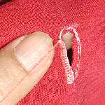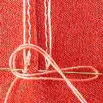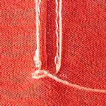 E中心の切り口から針を布地裏側へ、一針目の横(ミシン縫い目スレスレ外側)に正確に針を出しましょう。 | F針を約3分の1出し糸を1回(時計回り)巻き付け、針を右の方へ抜きましょう。 | G針目を揃える為。一針目からハトメ穴の手前まで、針目と締める力、糸を抜く方向を同じにしましょう。 | |
